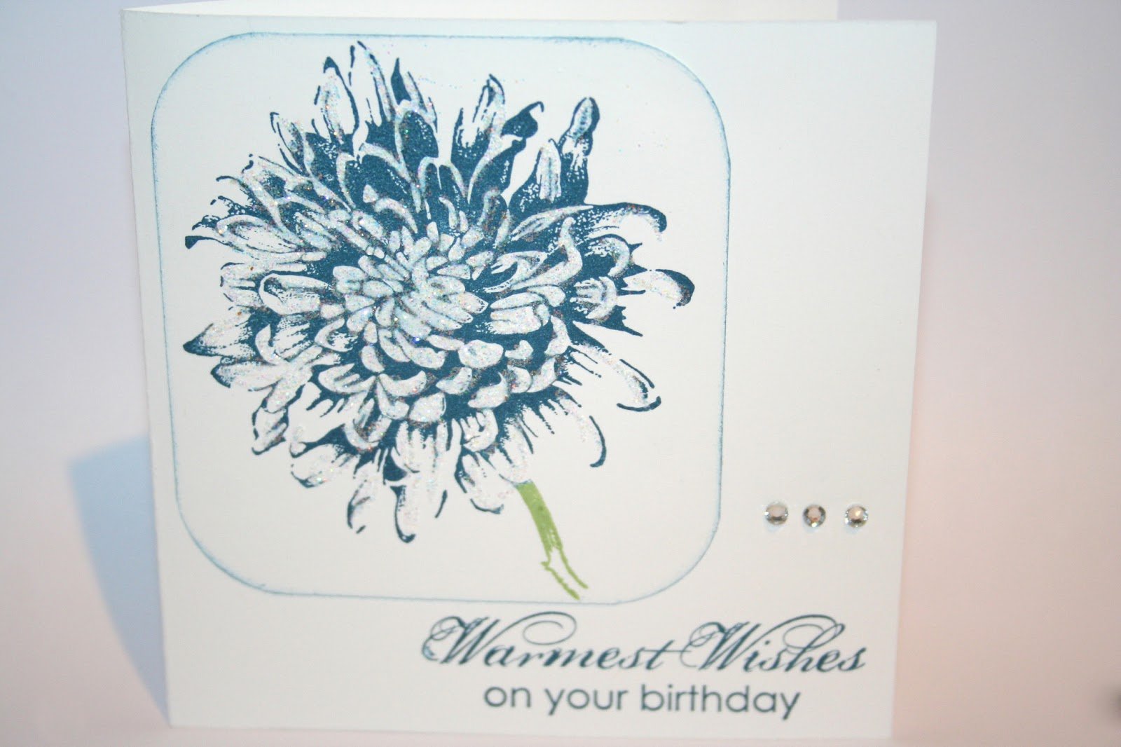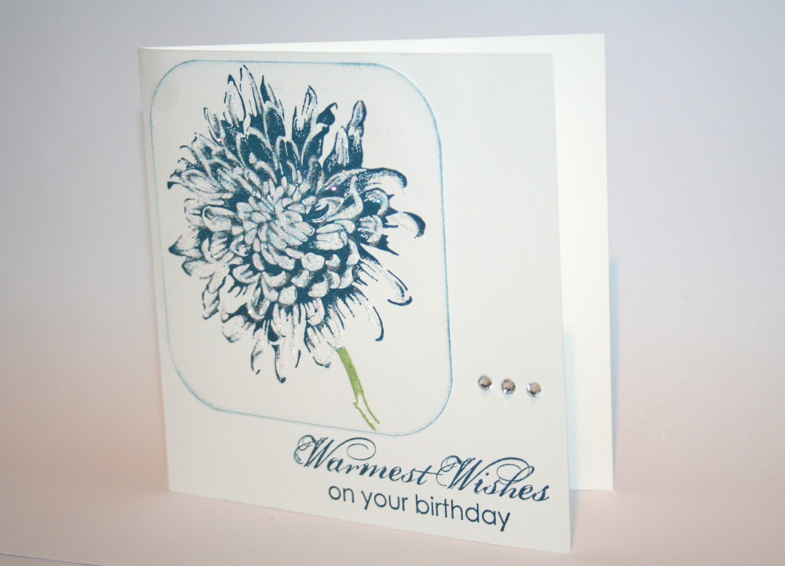 A small simple card made using Whisper White card stock, Midnight Muse ink pad, Bloomin with Kindness stamp set for the bloom and sentiment.  Just added a couple of rhinestones, and glitter to finish off.  The glitter doesn’t show up very well but the whole of the bloom is covered in glitter.   You just have to add bling!!