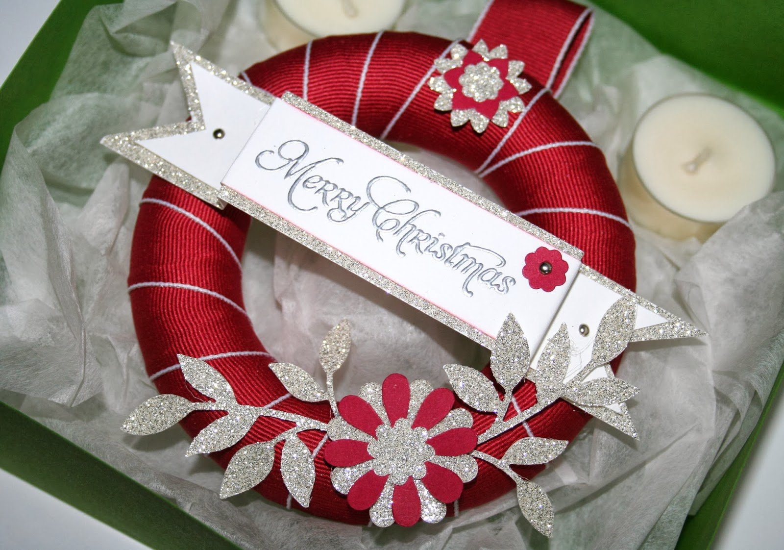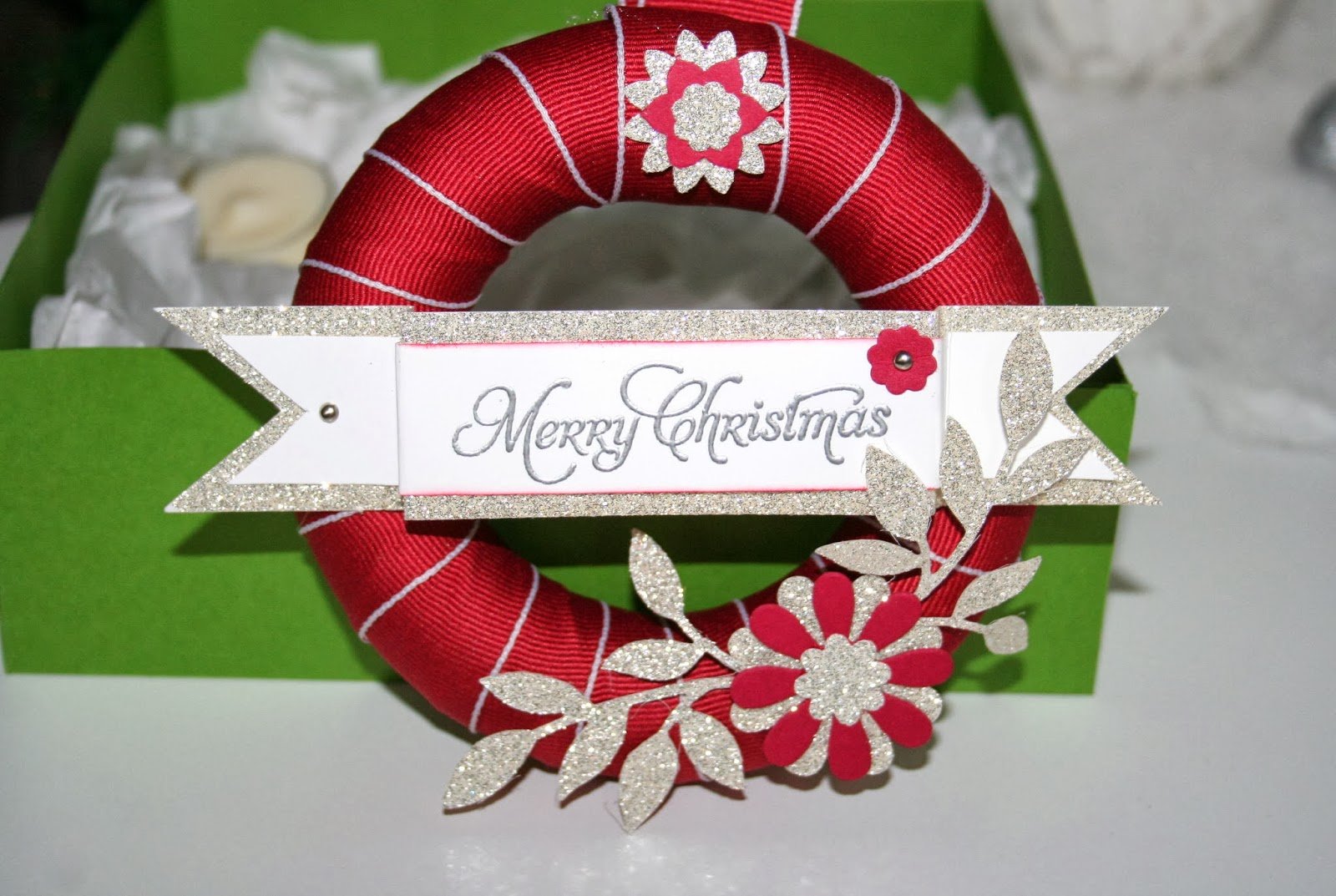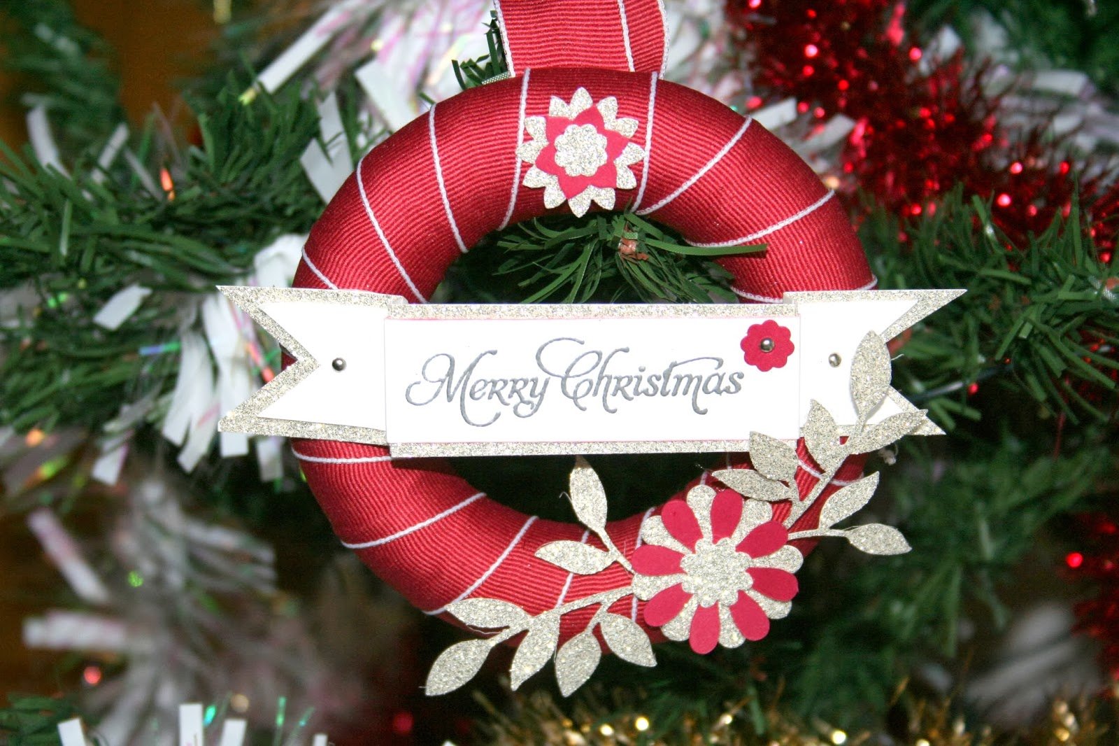 | The foam ring was covered using the gorgeous Cherry Cobbler 1″ stitched edged Grosgrain ribbon, secured with pins. The leaves were made using the Little Leaves Sizzlit cut from Silver Glimmer card. The flowers were made using the Boho Blossoms Punch and the Blossom Party Originals die. The small flower was made using the Itty Bitty punch and secured using a silver brad. The sentiment was from the More Merry Messages stamp set |