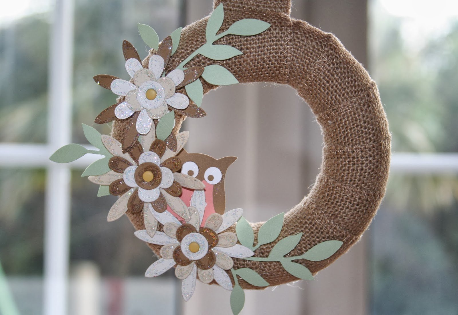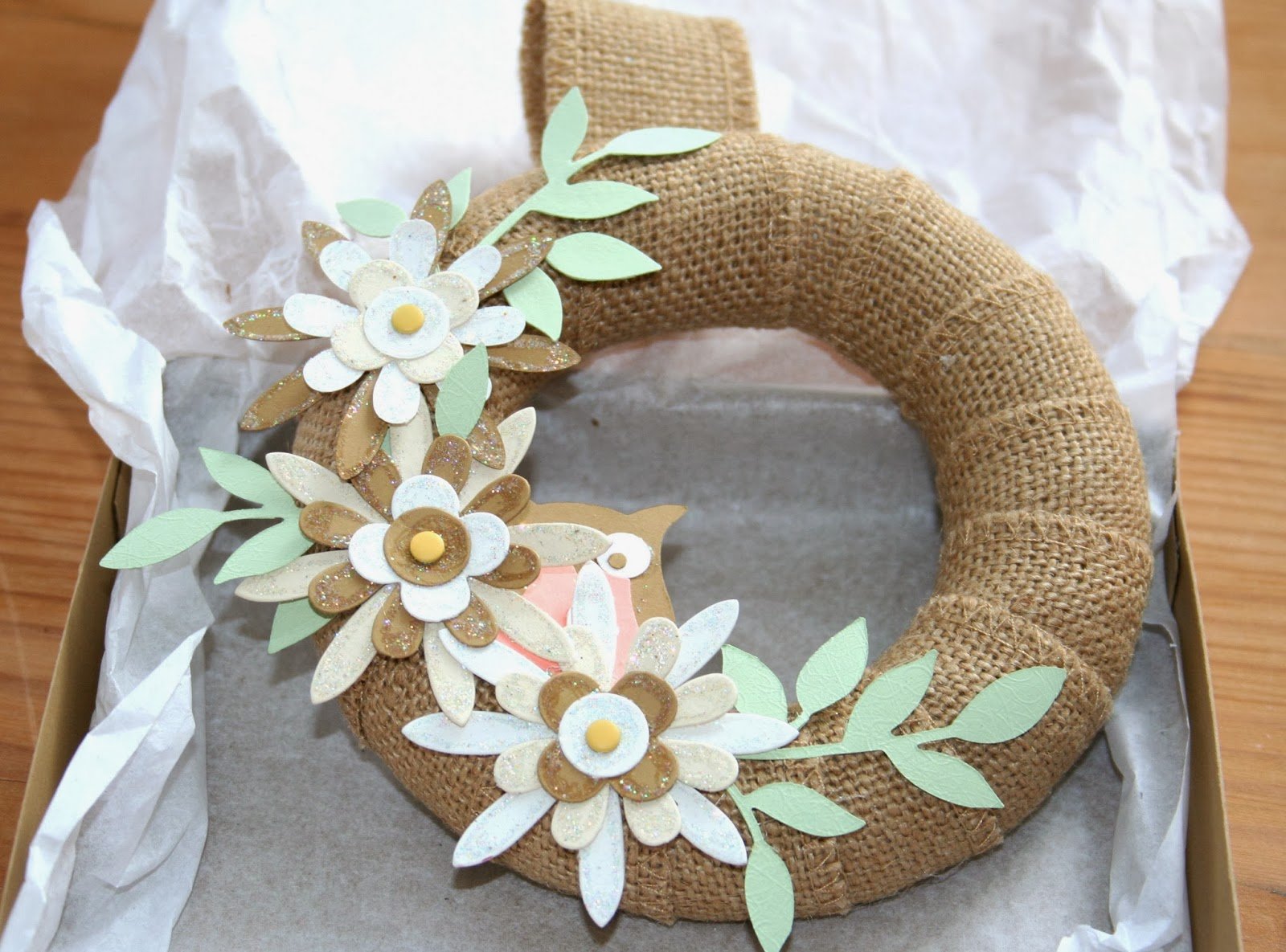 | Here’s the little gift inside. Can you see the peeping owl! Oh I loved putting this one together. As you can see a polystyrene flat backed ring has been covered in the gorgeous burlap ribbon and secured with pins at the back. |