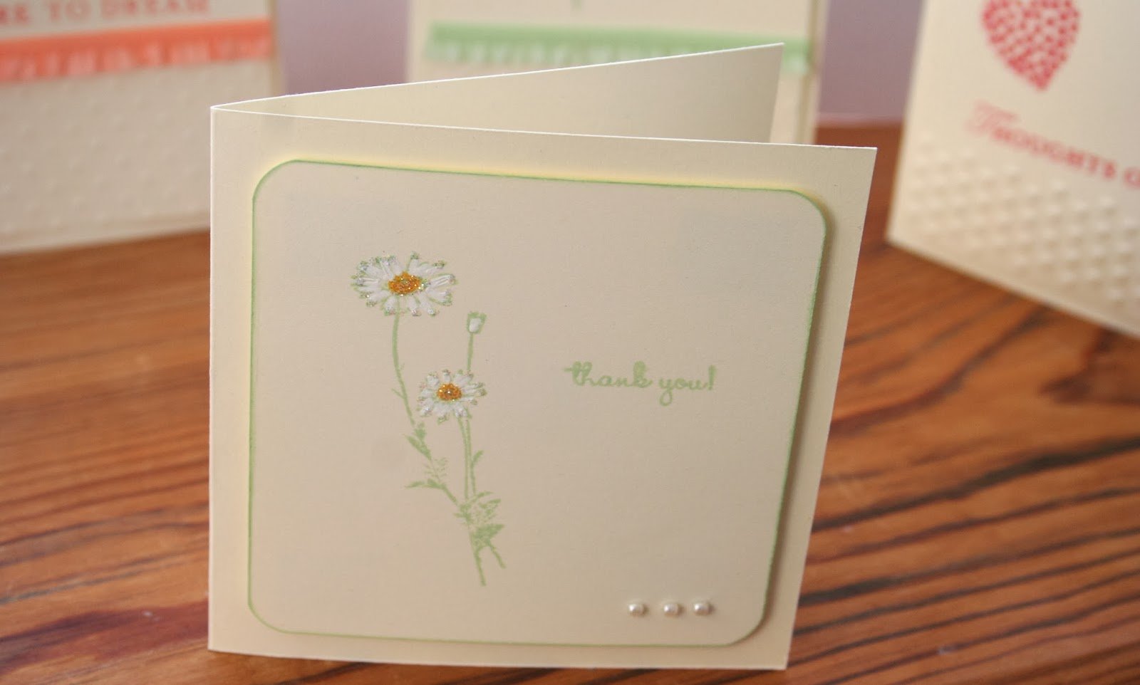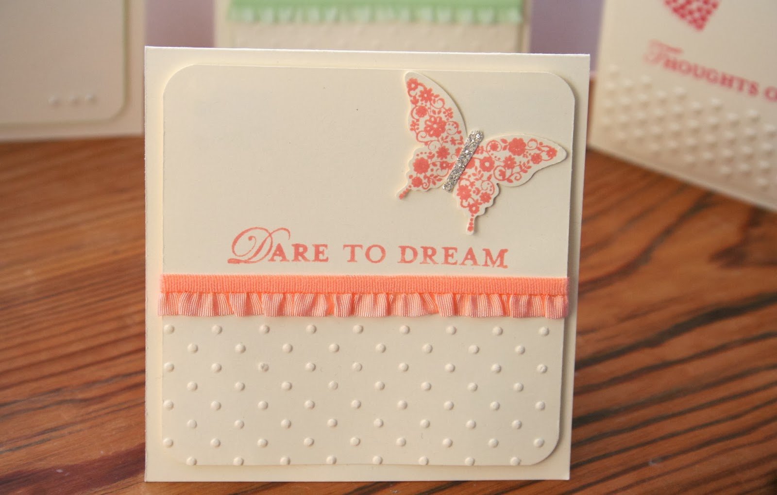 So I came up with these. A set of four 4″ x 4″ cards housed inside a matching box. The DSP Sweet Sorbet matched perfectly, of course, with the Crisp Cantaloupe and Pistachio Pudding card stock.