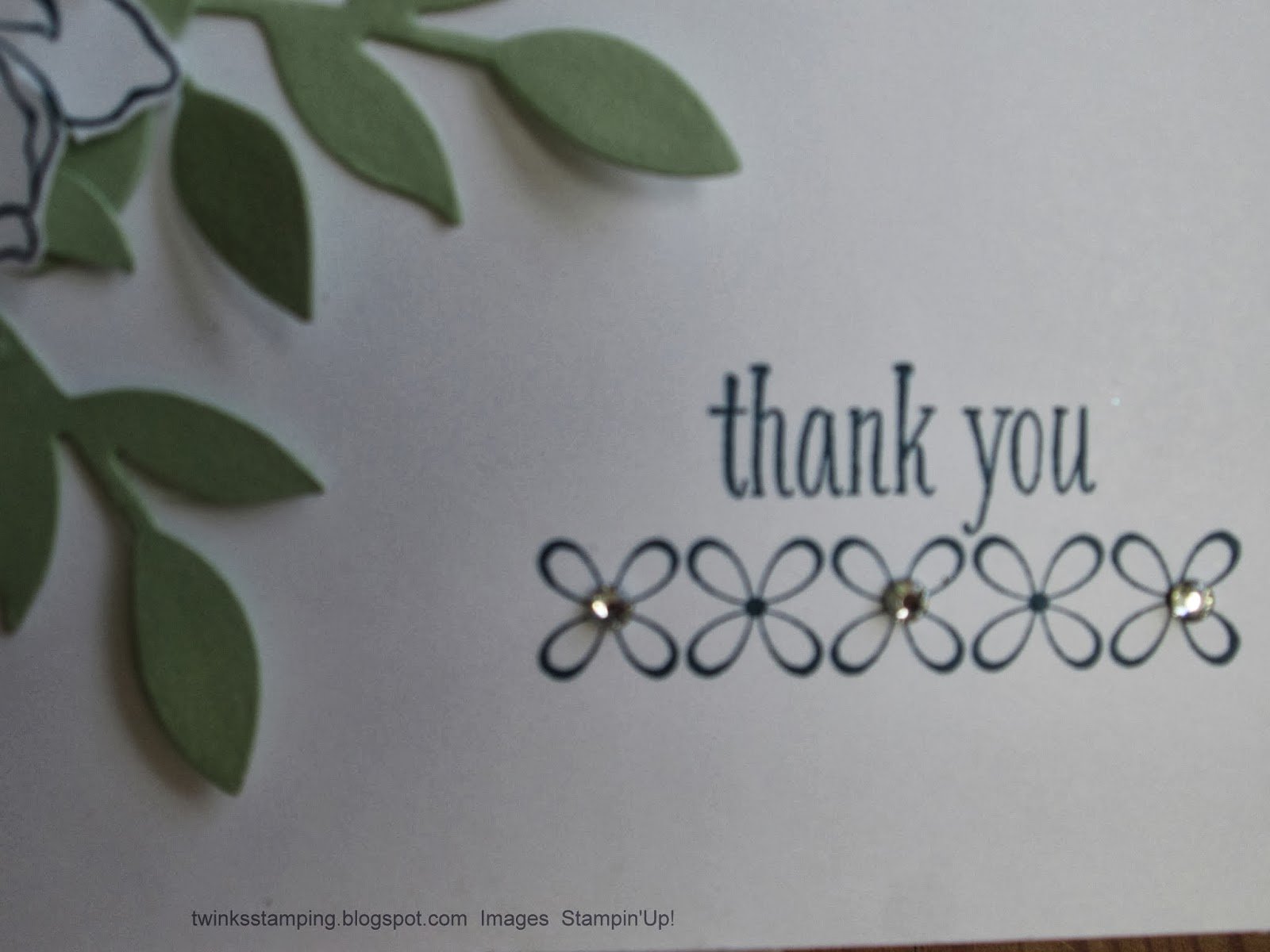 The sentiment stamp is from the Peaceful Petals stamp set also.  However the really cute flower border was free from the SAB promotion set You’re Lovely.  Of course the card was finished off with rhinestone bling!