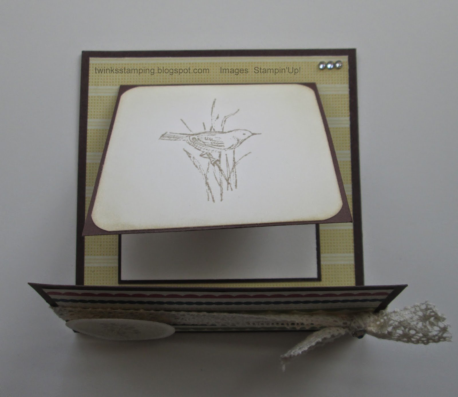 Love the elegant simplicity and real style of this card. The bird sketch is an ideal stamp for this card, and the brighter bottom dp is so pretty with the grass-y look of the top dp. Love that lacey bow too. TFS & Hugs