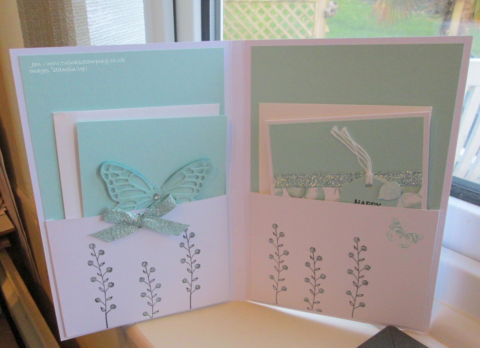 Inside containing two decorated pockets and showing two cards that we made