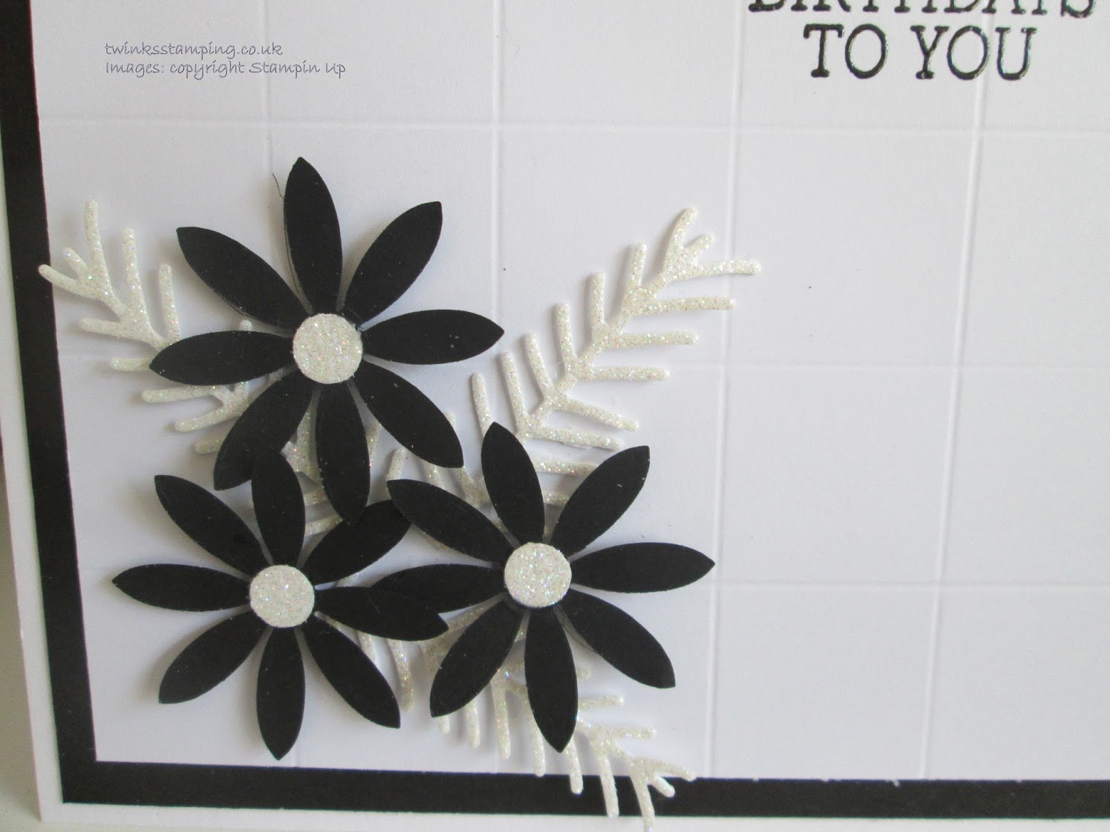 Anyway, today I am sharing a card I made for a lovely lady last week.  I am very much a fan of daisy like flowers and I made these using the Succulents Framelits Dies (retiring at the end of this month) and the Pretty Pines Thinlets.  There is,of course, glimmer added.  Hope my friend liked her card.