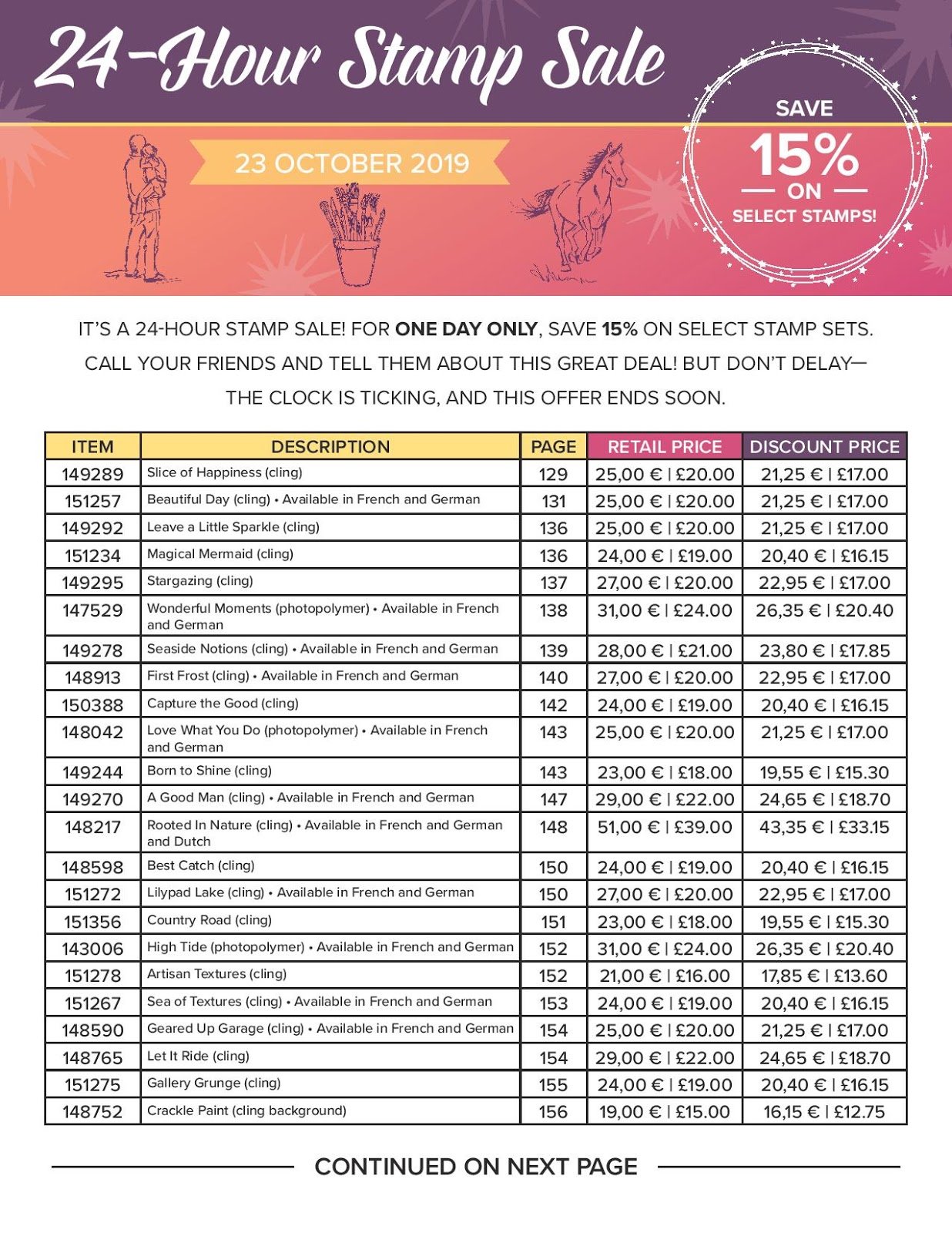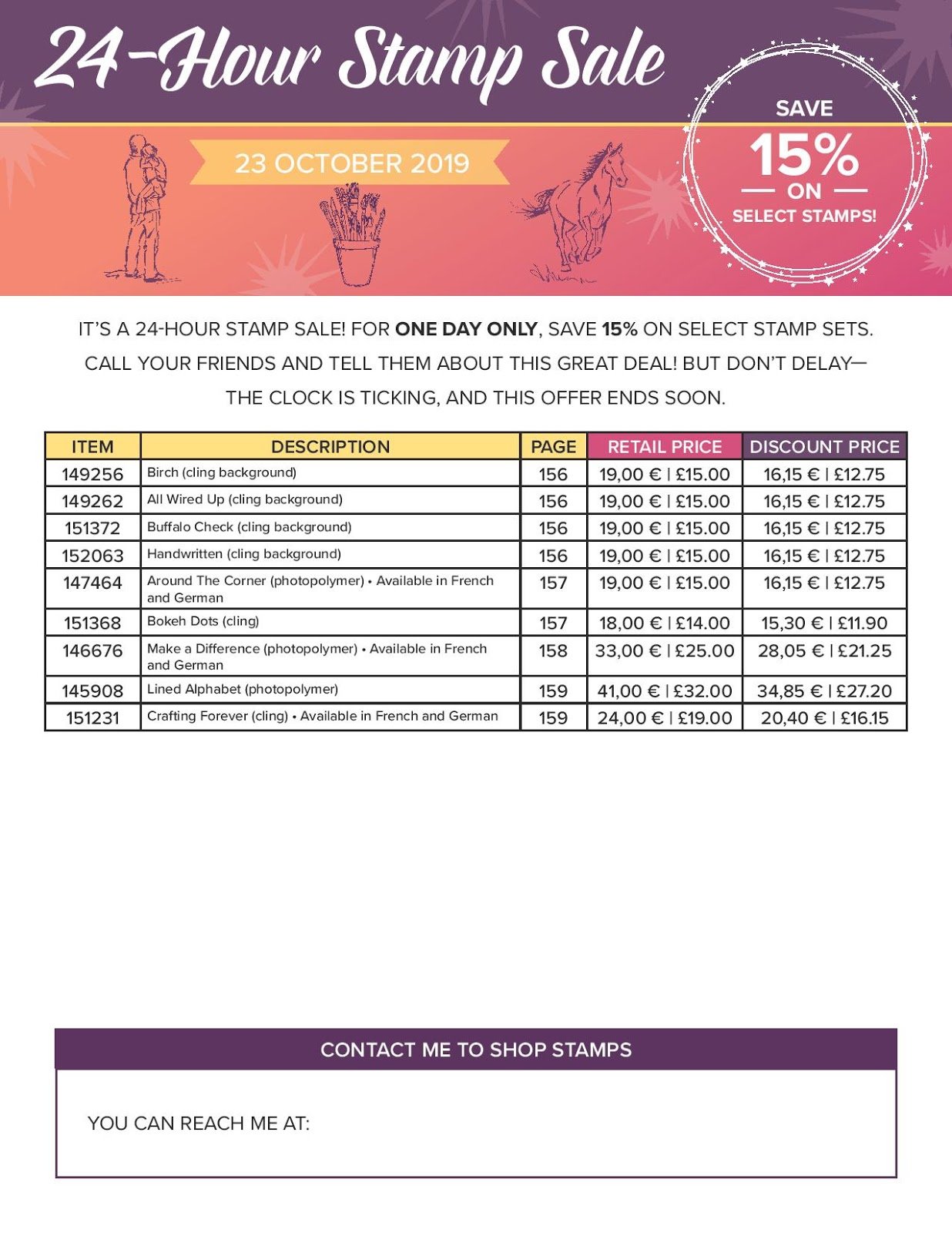Stampin’ Up! 24 hour stamp sale starting 23 October 2019 ! Get that 15% discount whilst you can on some fabulous stamp sets . Pics are at bottom of this page of all of the stamps on offer