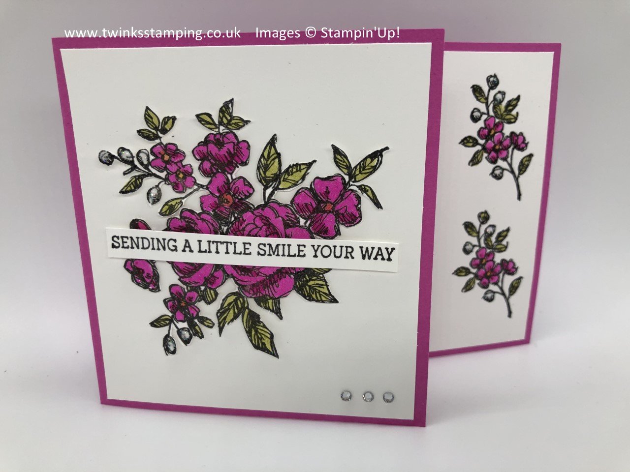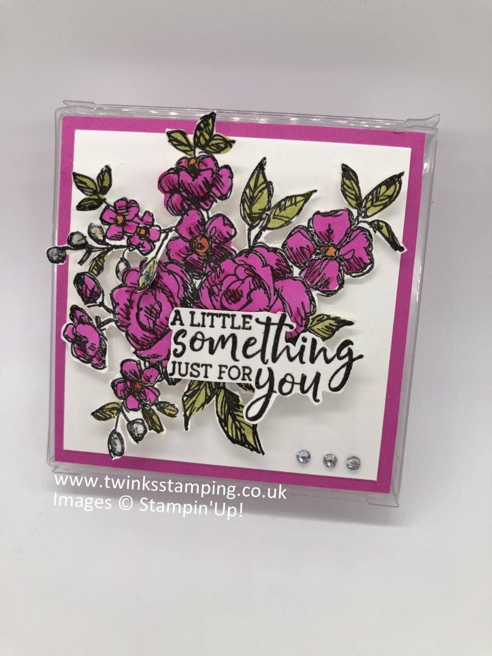 Hi, today I am sharing my card and decorated box using the Fancy Phrases Stamp set, together with the Magenta Madness cardstock and Stampin’Blend pens. I am loving the colour and I am loving the stamp set too! The flower reminds me very much of one of the flowers that was used on the Bird Ballad DSP. Love it! Once again, my designs are very clean and simple to make.
