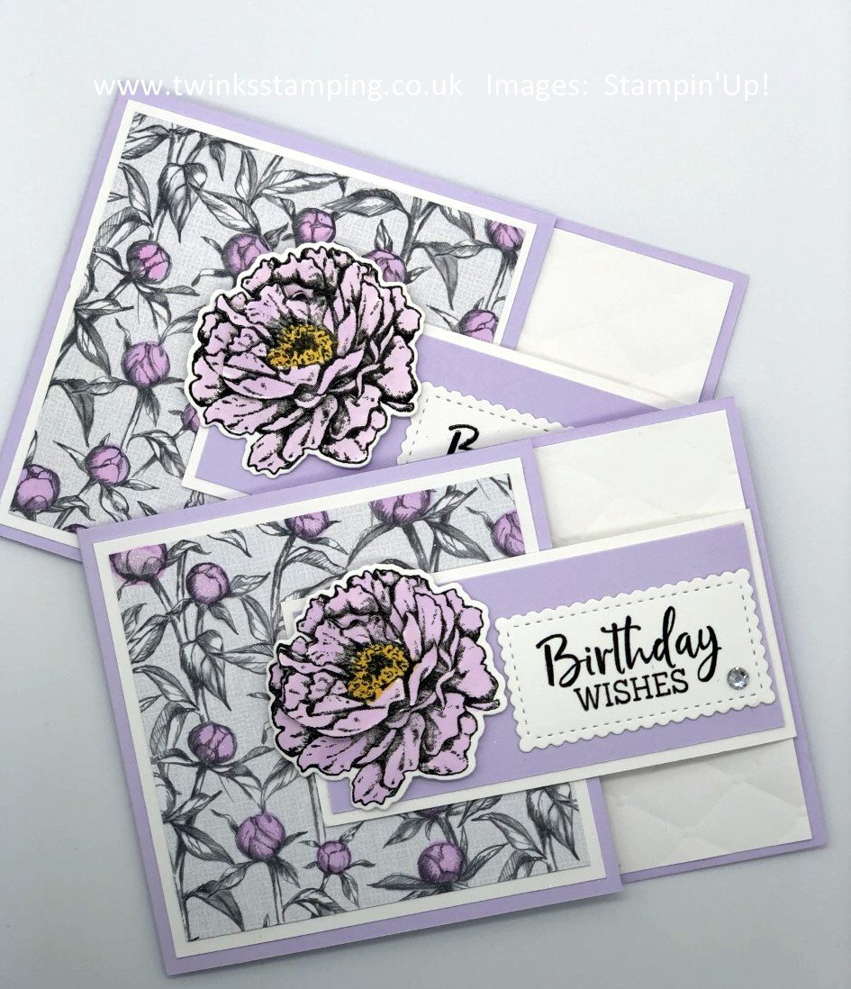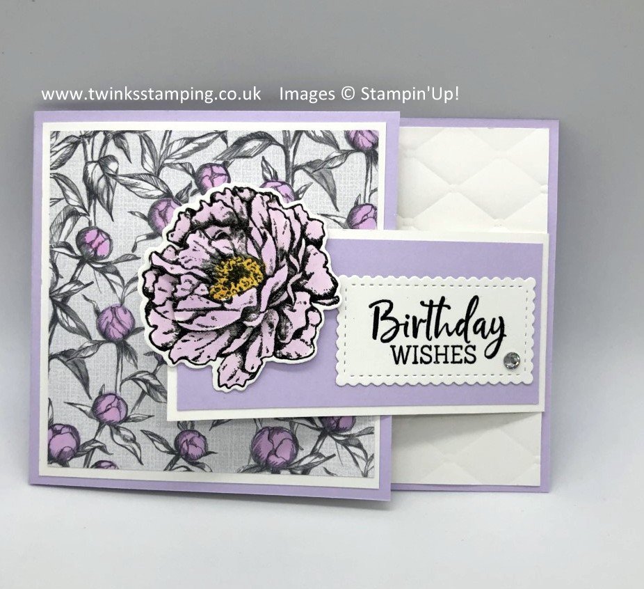 I have used the gorgeous Prized Peony bundle which includes the stamp set and the dies, together with the lovely Peony Garden Designer Series Paper. The sentiment was from the Fancy Phrases stamp set and the label was made using the Stitched So Sweetly dies. The colour I chose for this card was, Purple Posy. I have also included the same fun fold card using different papers