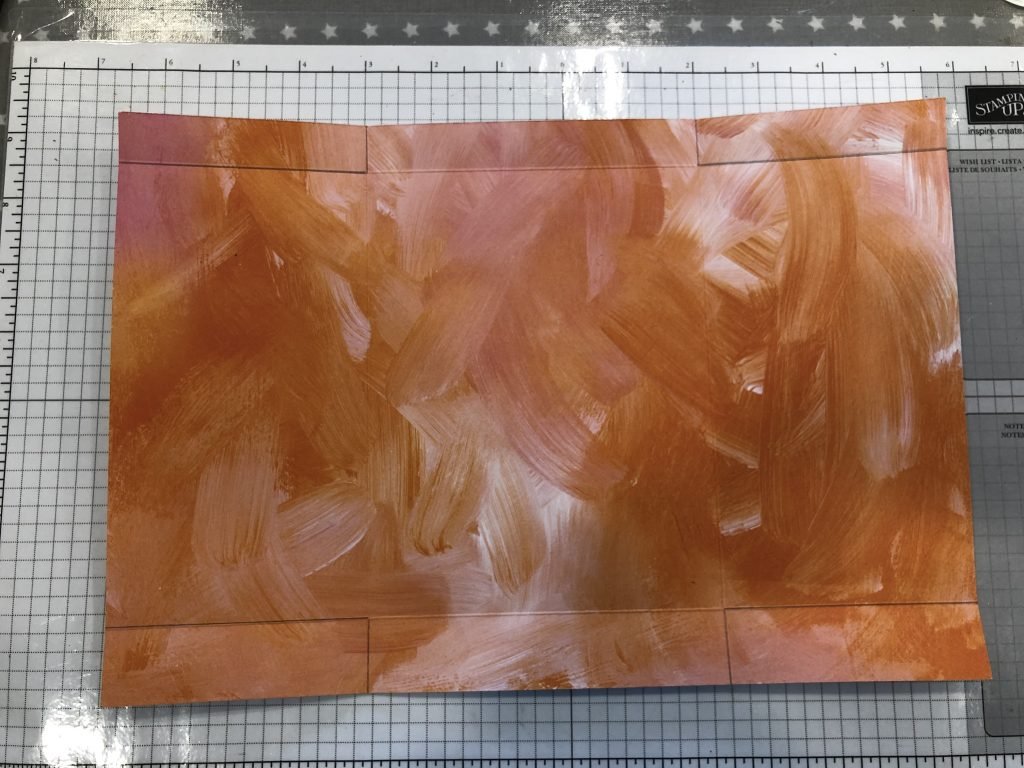 • Cut Final Art Floral paper to measure 12″ x 8 1/4″ (30.5cm x 21cm). Place the short side to the top of your cutter and score at 1″ & 7 1/2″ (2.5cm & 19cm). Turn the paper so that the long side is along the top of your cutter and score at 3 1/2″ x 8 1/2″ (8.9cm & 21.6cm).