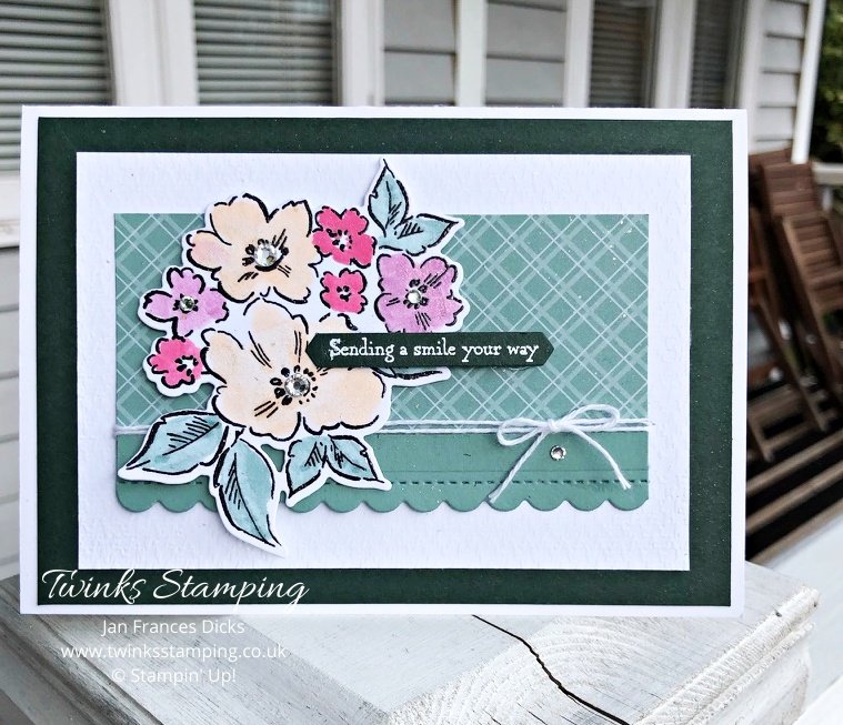 This is my all occasion card where I have used the Evening Evergreen as the dark mat, the smaller mat is using the lovely new In-colours Designer Series Paper in Succulent Sage, the flowers are coloured using Polished Pink, Fresh Freesia and Pale Papaya.